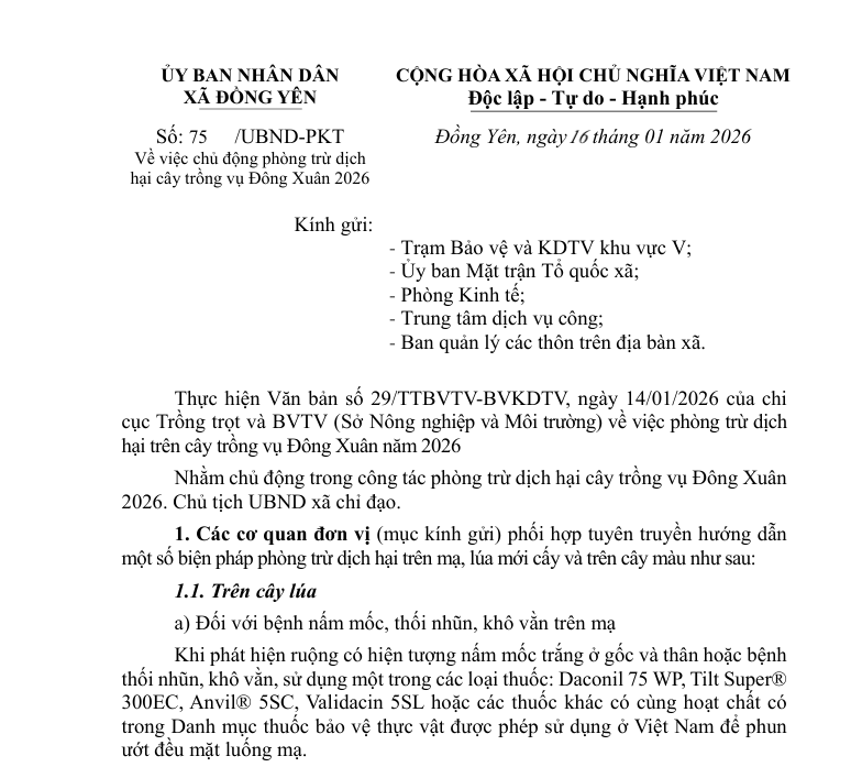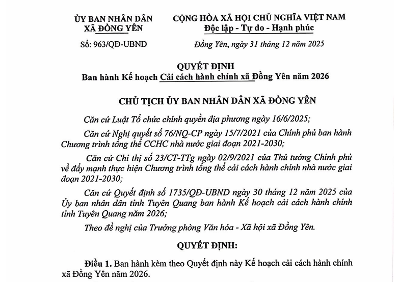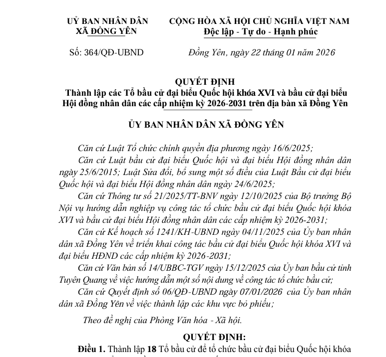 QUYẾT ĐỊNH - Thành lập các Tổ bầu cử đại biểu Quốc hội khóa XVI và bầu cử đại biểu Hội đồng nhân dân các cấp nhiệm kỳ 2026-2031 trên địa bàn xã Đồng Yên