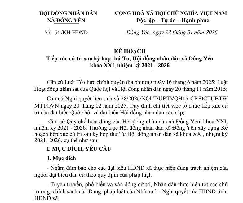 KẾ HOẠCH - Tiếp xúc cử tri sau kỳ họp thứ Tư, Hội đồng nhân dân xã Đồng Yên khóa XXI, nhiệm kỳ 2021 - 2026