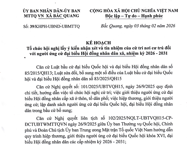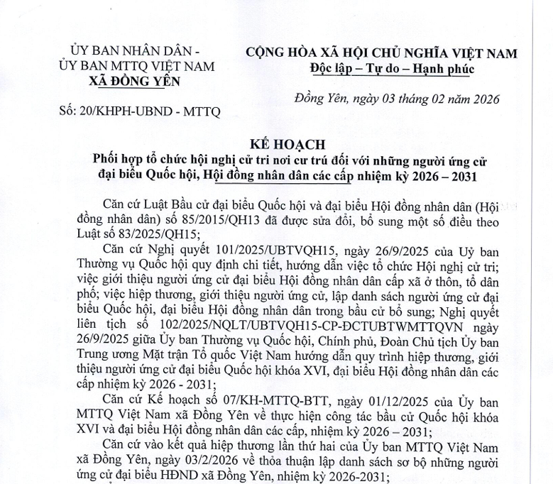 KẾ HOẠCH- Tổ chức hộ nghị cử tri nơi cư trú đối với những người ứng cử đại biểu Quốc hội, HĐND các cấp nhiệm kỳ 2026 - 2031