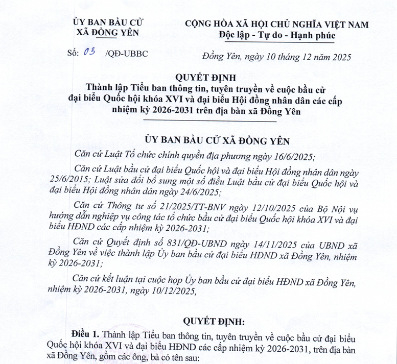 QUYẾT ĐỊNH - Thành lập tiểu ban thông tin, Tuyên truyền về cuộc bầu cử đại biểu Quốc hội khóa XVI và bầu cử HĐND các cấp, nhiệm kỳ 2026 - 2031 trên đị bàn xã Đồng Yên