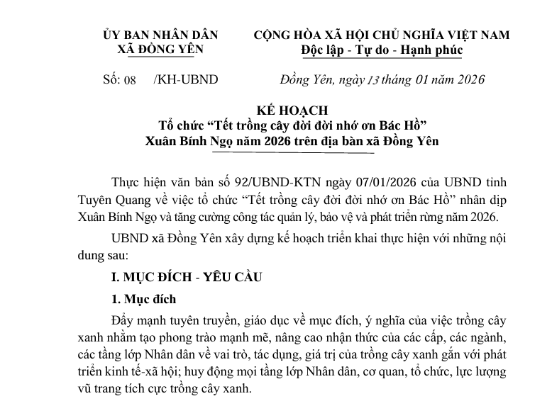 KẾ HOẠCH - Tổ chức “Tết trồng cây đời đời nhớ ơn Bác Hồ” Xuân Bính Ngọ năm 2026 trên địa bàn xã Đồng Yên