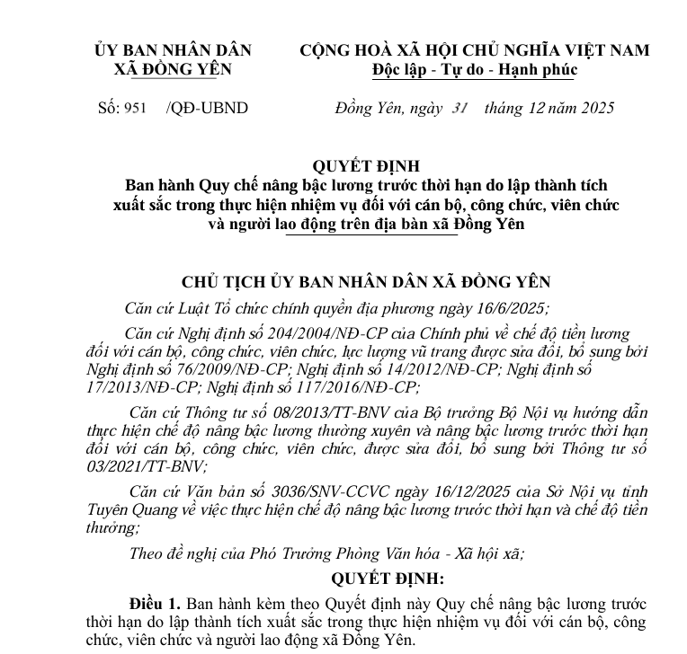 QUYẾT ĐỊNH - Ban hành Quy chế nâng bậc lương trước thời hạn do lập thành tích xuất sắc trong thực hiện nhiệm vụ đối với cán bộ, công chức, viên chức và người lao động trên địa bàn xã Đồng Yên