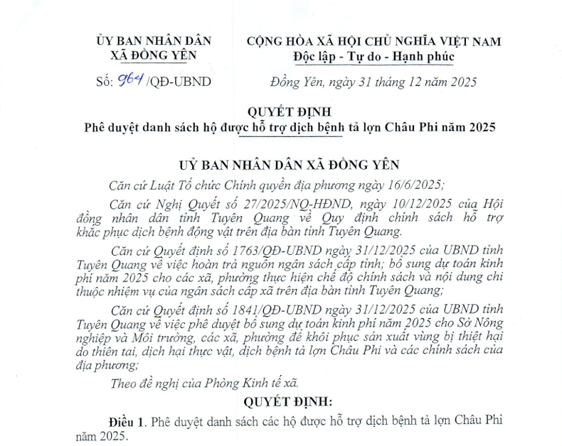 QUYẾT ĐỊNH - Phê duyệt danh sách hộ được hỗ trợ dịc tả lợn Châu Phi năm 2025